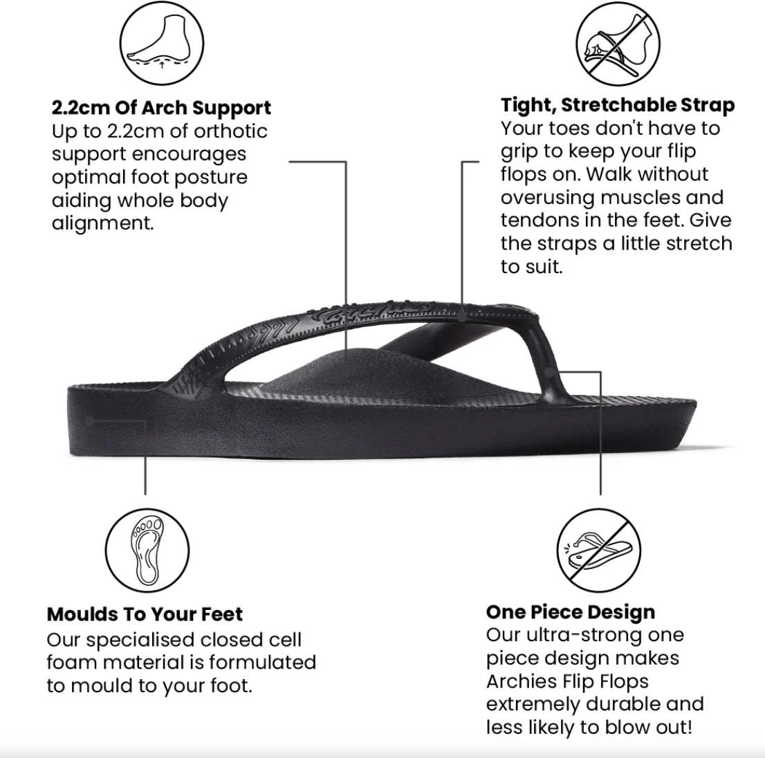 Archies have got pretty high standards when it comes to comfort, and typical flip flops that just aren't up to scratch. So they put their heads together and created a pair of arch support flip flops so comfy and supportive, you'll never want to take them off your feet!